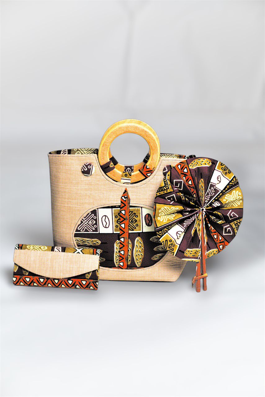 Complete 3-piece Afrocentric set with beige tote, matching folding fan, and mini wallet — blending cultural elegance with everyday practicality.