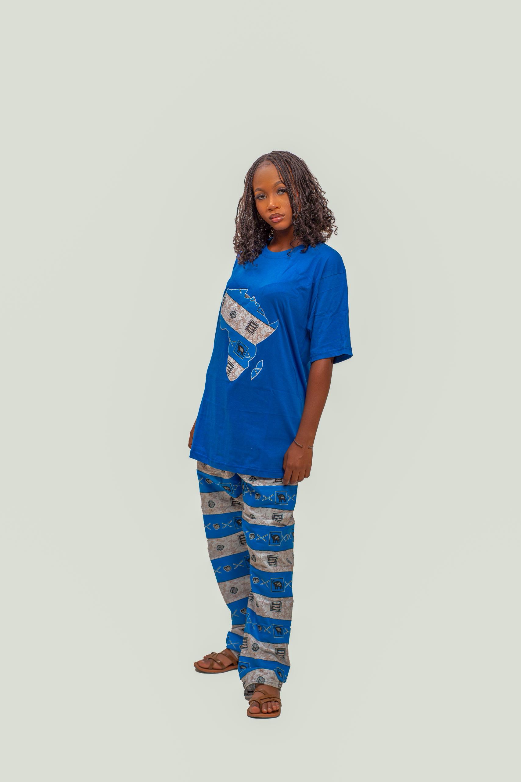 Celebrate heritage with the AfroVibe Unisex Heritage Set — a bold fusion of African pride and contemporary streetwear. Featuring an oversized cobalt blue T-shirt with a striking Africa map graphic and symbolic print overlays, paired with lightweight wax print trousers adorned in coordinating tribal motifs, this set offers comfort, style, and cultural expression. Perfect for casual outings, festivals, or repping African identity in everyday fashion.