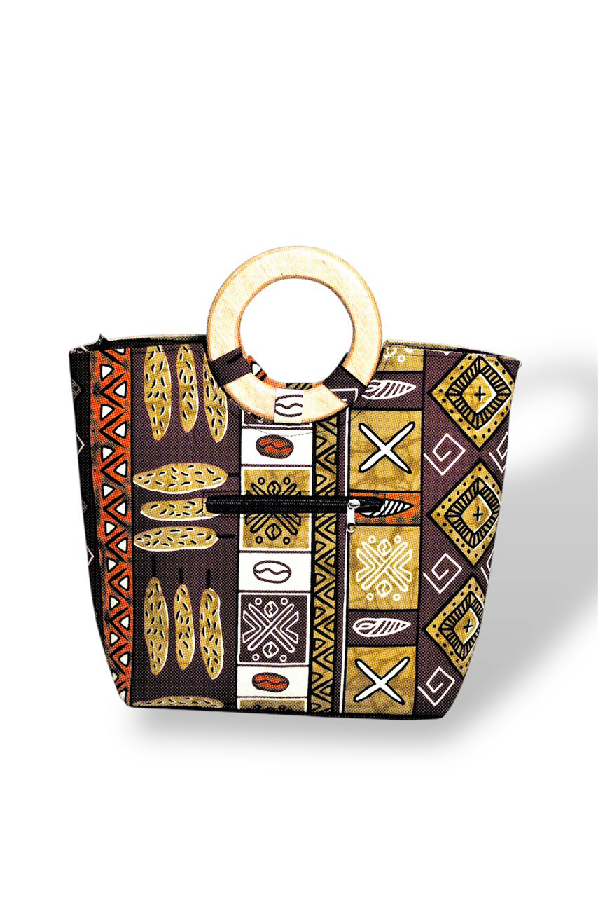 The Bold Tribal Symbols Tote with Wooden Ring Handles is a celebration of African artistry, heritage, and symbolism. Featuring an all-over print of traditional motifs in rich earth tones of gold, terracotta, and white, its symmetrical geometric layout evokes a handcrafted, meaningful charm.