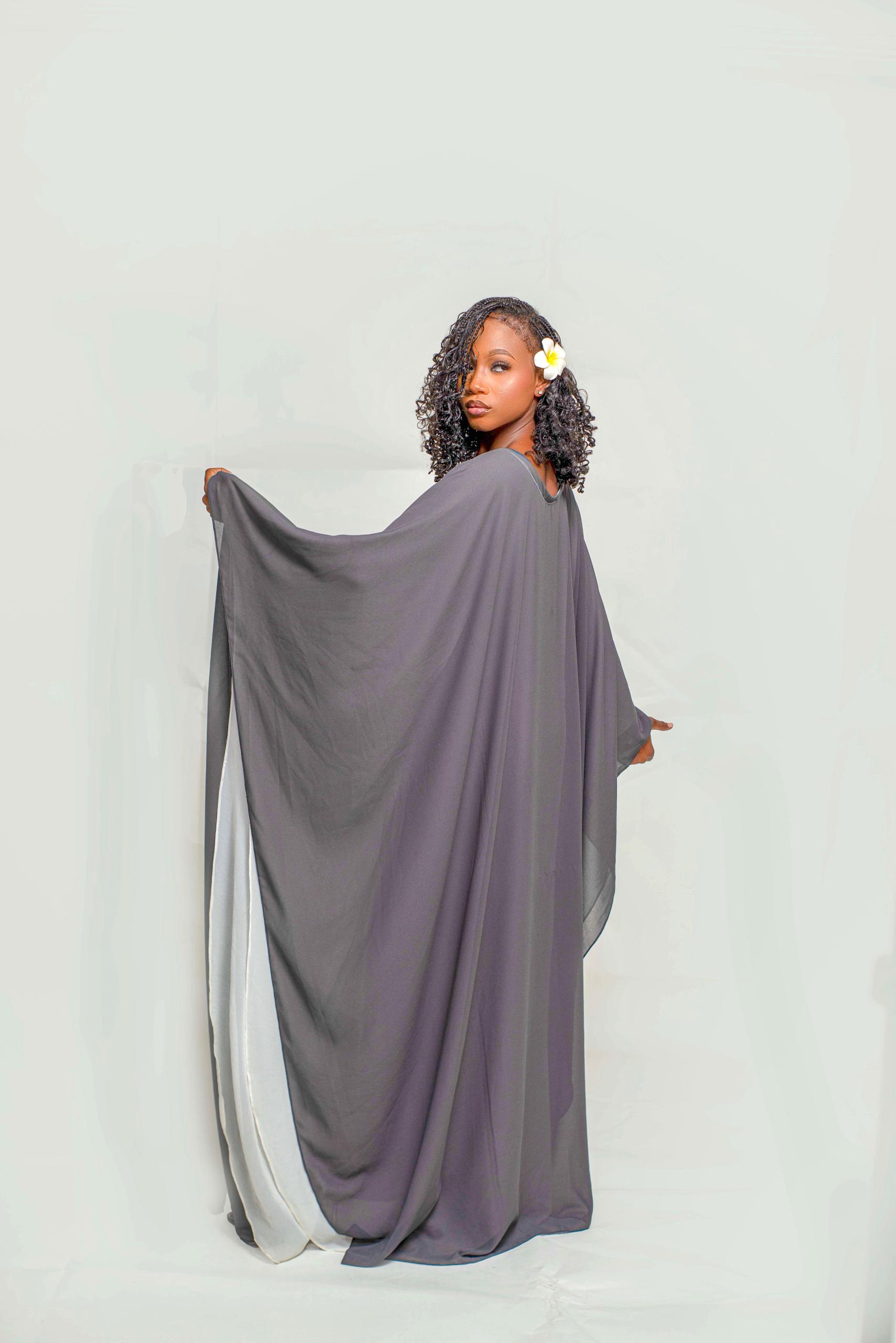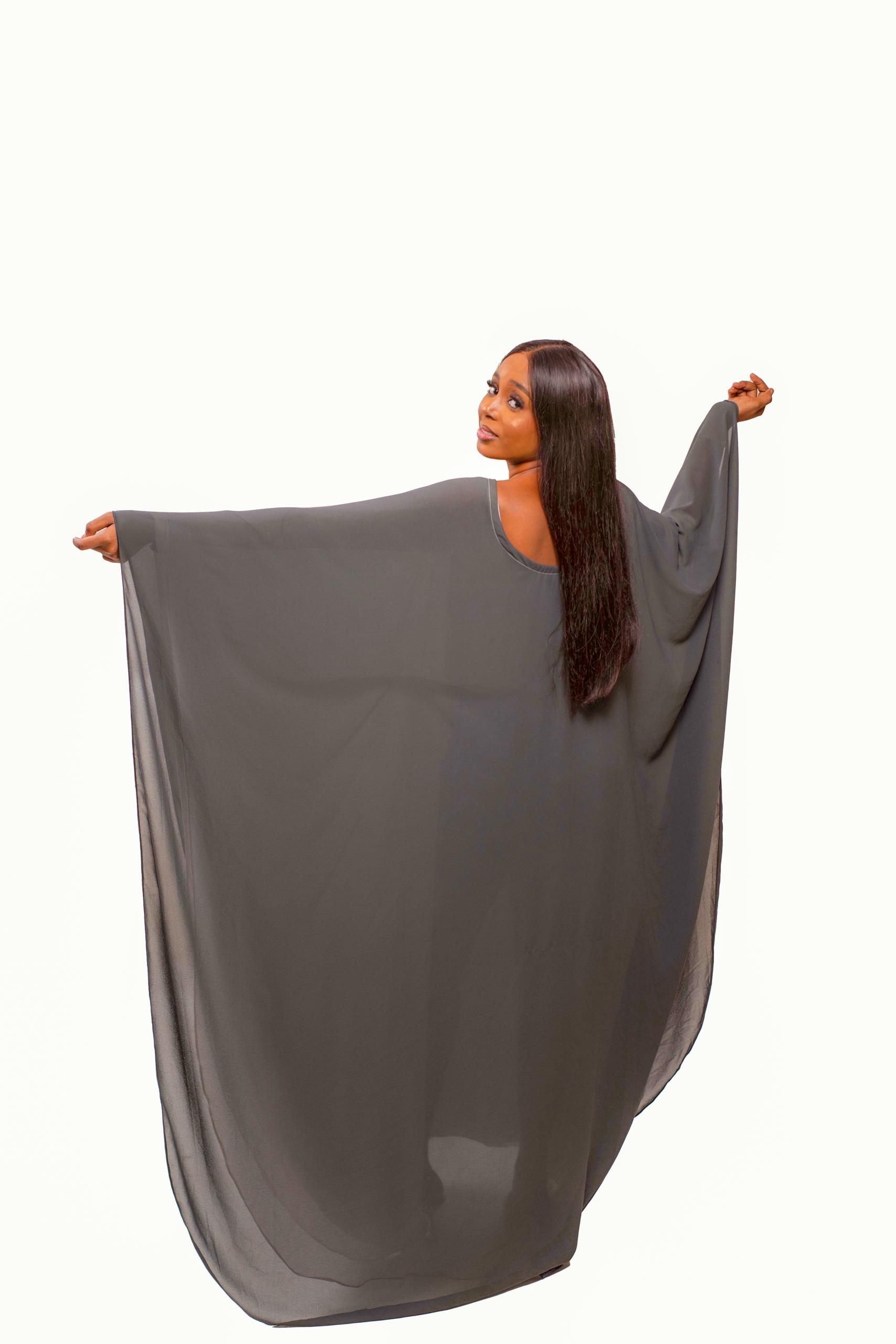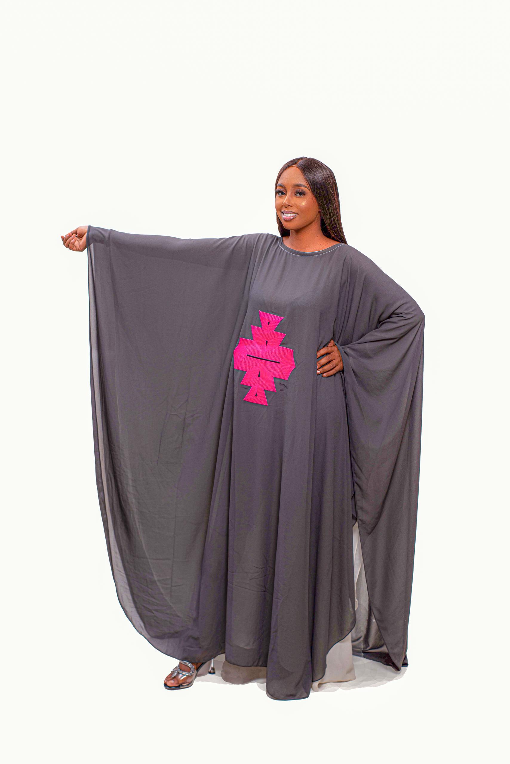 The “Ebène & Fuchsia” Statement Boubou merges minimalist elegance with bold cultural expression. Crafted from deep charcoal breathable fabric, this free-flowing boubou features a striking hot pink geometric tribal-inspired motif at its center. Its wide batwing sleeves and draped silhouette offer comfort, movement, and effortless style, making it perfect for women who embrace confidence and cultural pride.