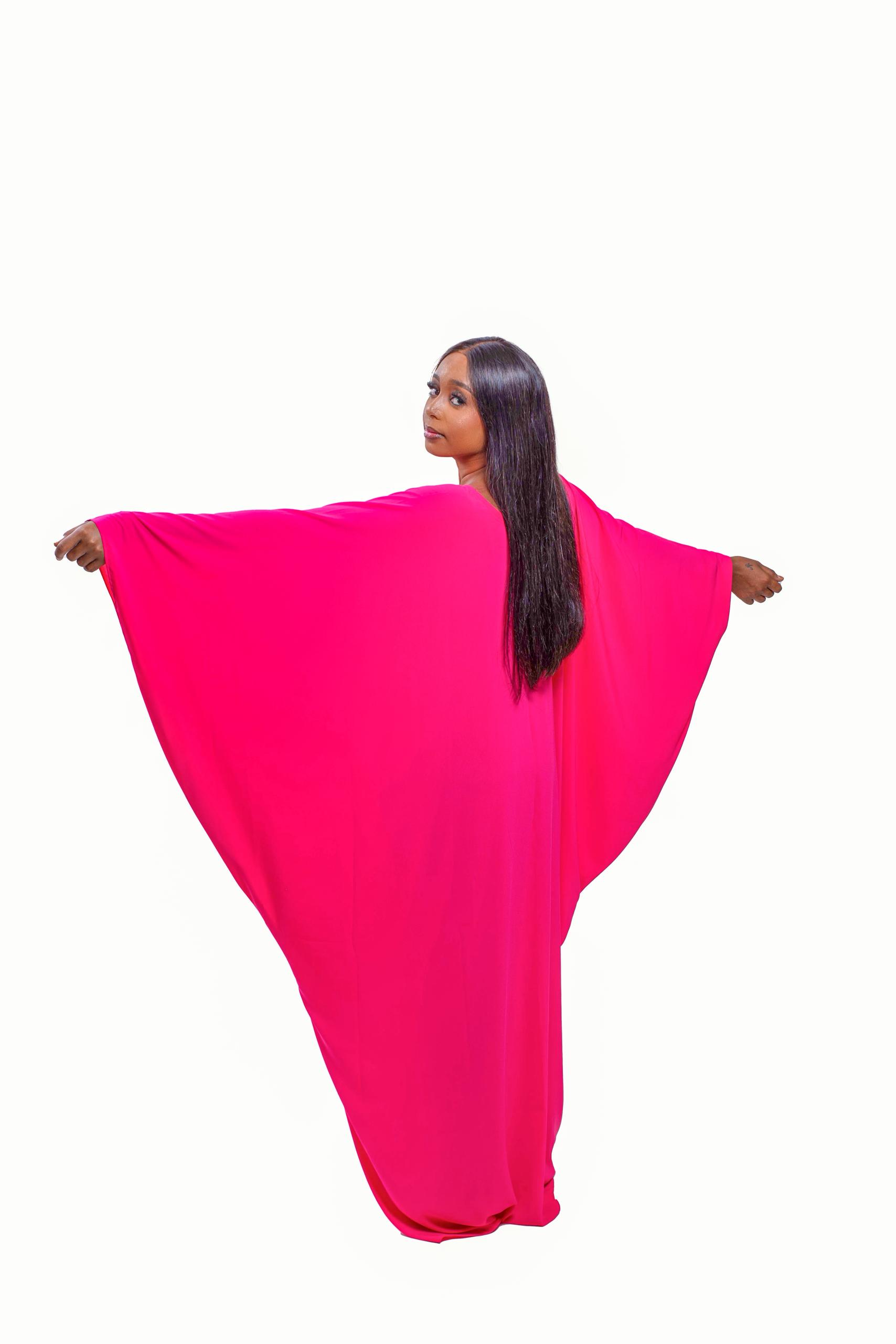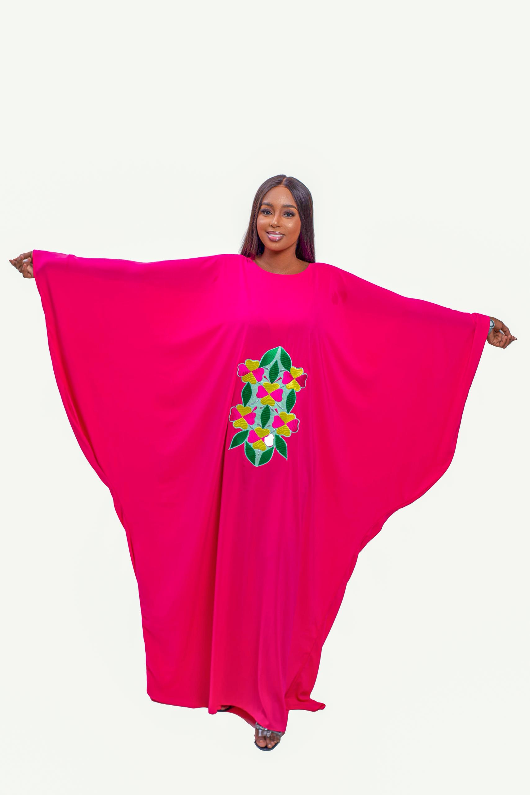 The “Floral Majesty” Fuchsia Embroidered Kaftan radiates elegance, culture, and confidence. This free-flowing fuchsia pink kaftan features intricate central floral embroidery in green, yellow, and pink, blending artistry with comfort. With wide batwing sleeves and a lightweight, breathable fabric, it drapes gracefully, offering freedom of movement while celebrating bold femininity. Perfect for festive gatherings, casual glam, or sacred self-care moments.