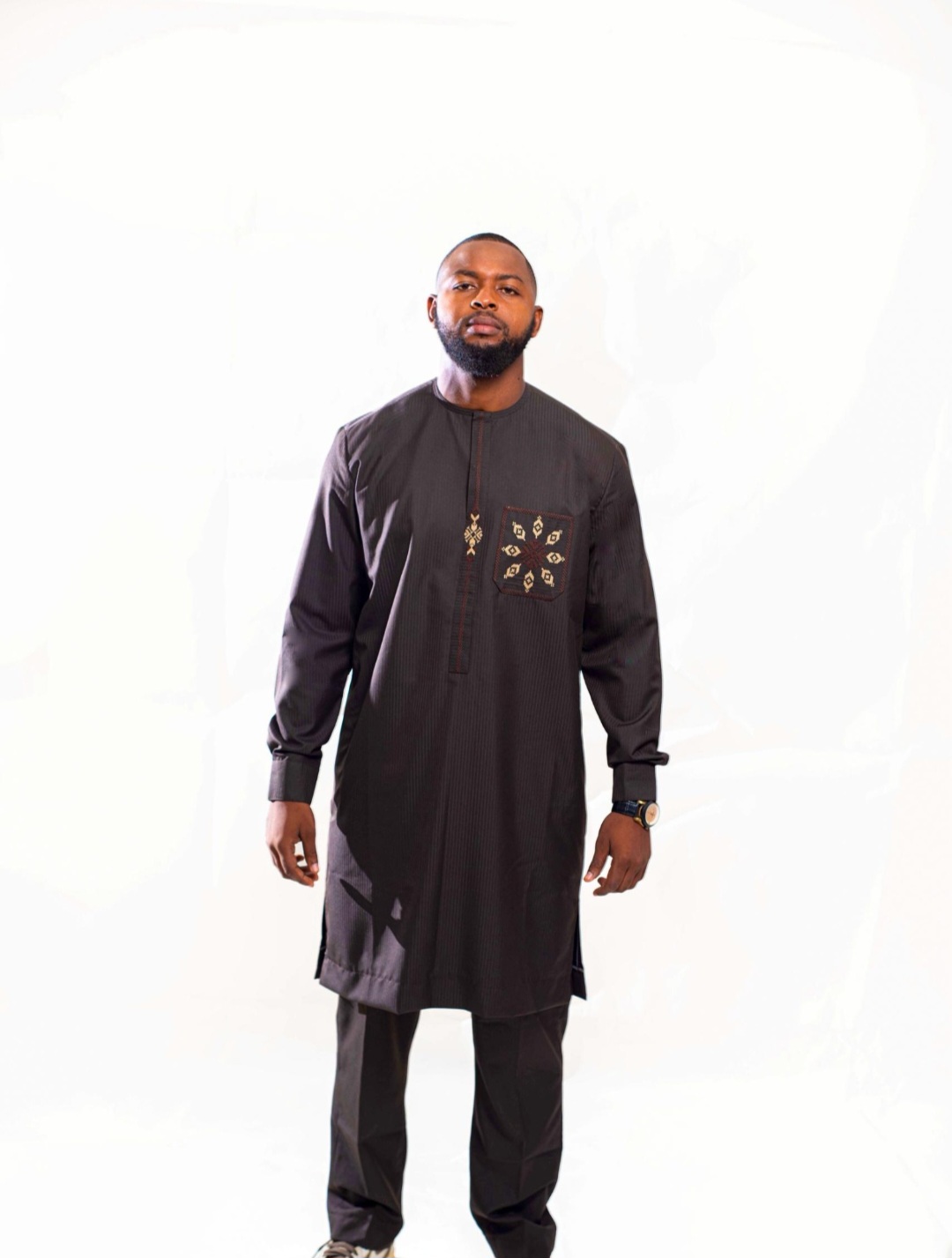 This Men’s Classic Black Agbada-Inspired Set combines the elegance of West African tradition with modern tailoring. The long-sleeve tunic, crafted from a subtly pinstriped black fabric, features a chest pocket with a gold embroidered motif — a symbol of balance and sophistication. The minimalist collar with concealed placket enhances the clean, contemporary lines, while the coordinated tapered trousers create a sharp, composed silhouett150e. Designed with breathable, premium fabric, this set delivers comfort without sacrificing presence, making it ideal for both cultural events and upscale occasions.