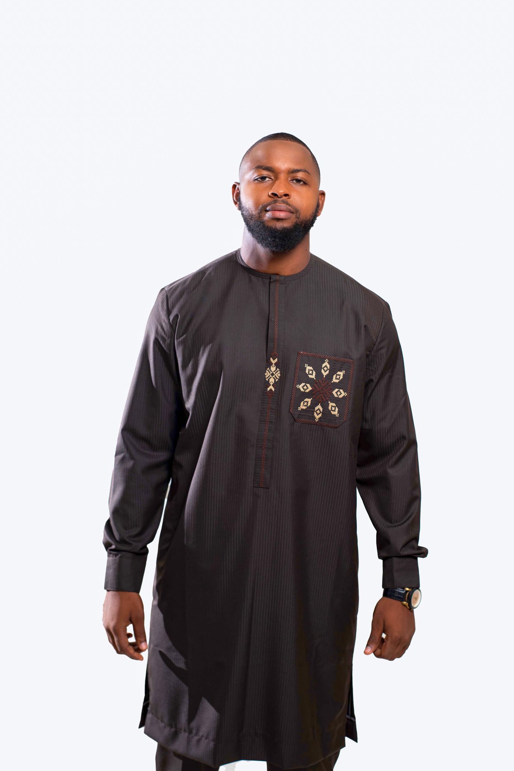 A refined black two-piece inspired by traditional agbada, featuring a long-sleeve textured tunic with intricate gold embroidery on the chest pocket and matching tailored trousers. Perfect for cultural celebrations and elegant formal occasions.