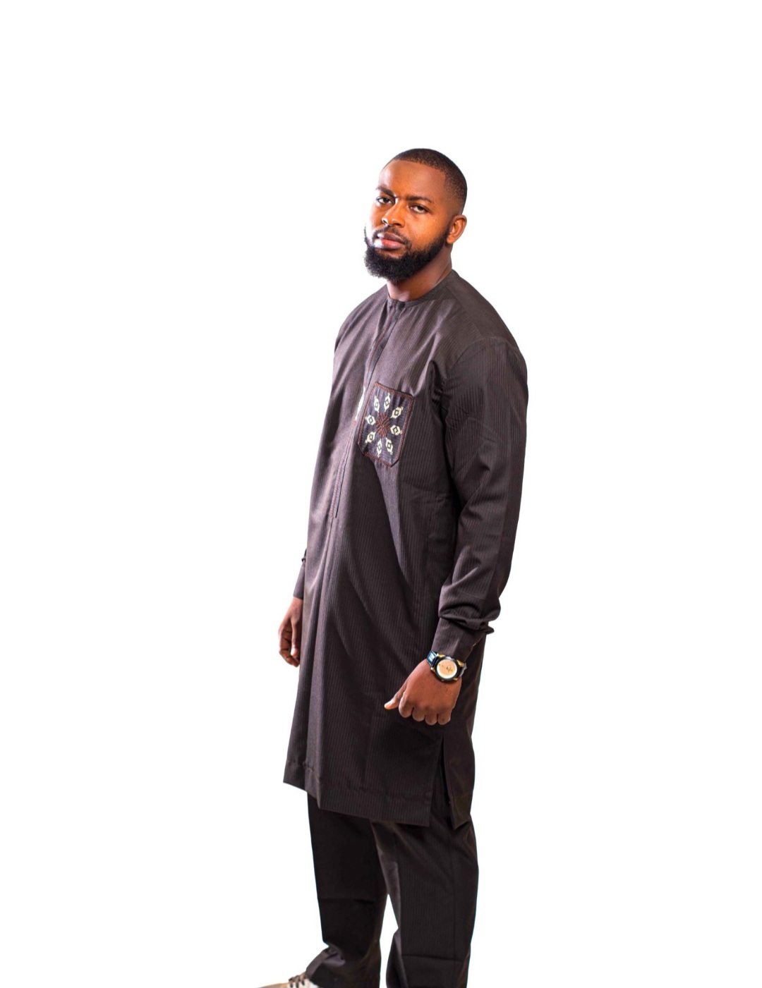 Men’s Classic Black Agbada-Inspired Set with Embroidered Pocket Detail