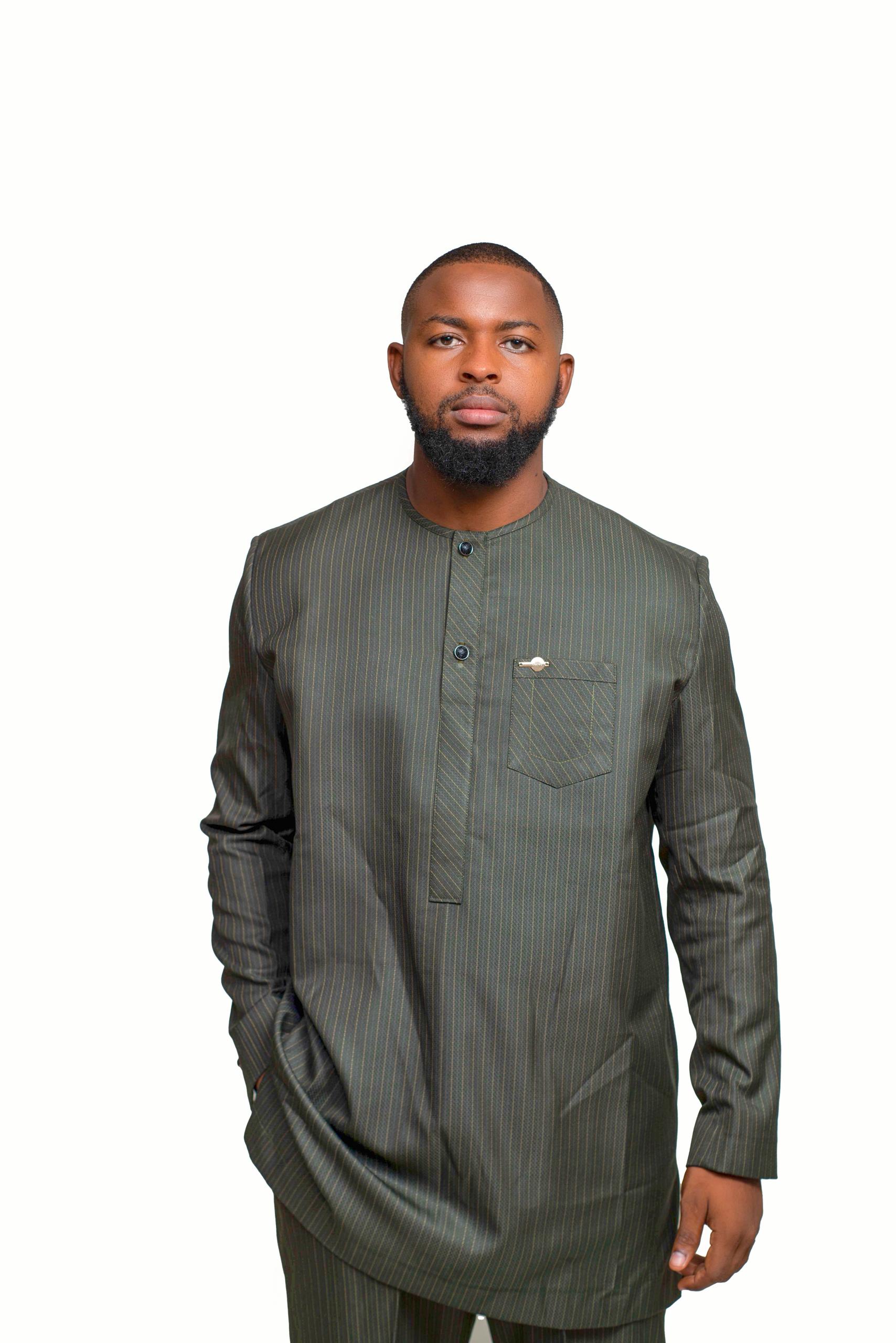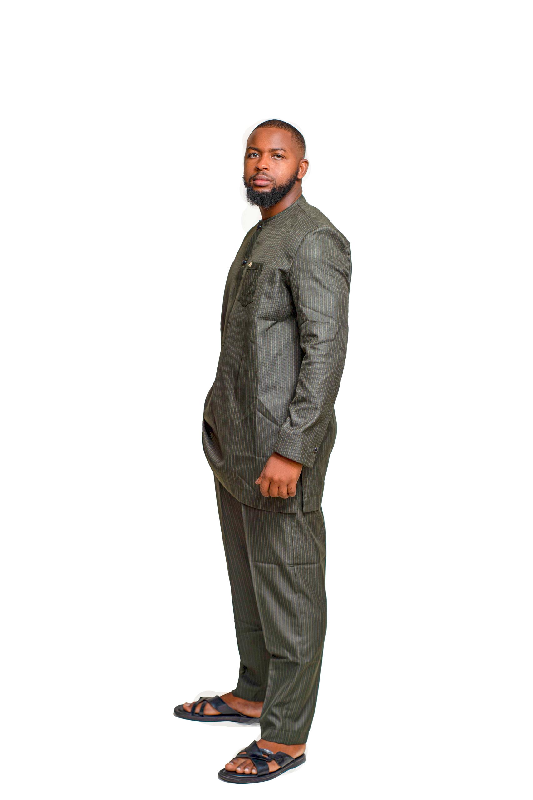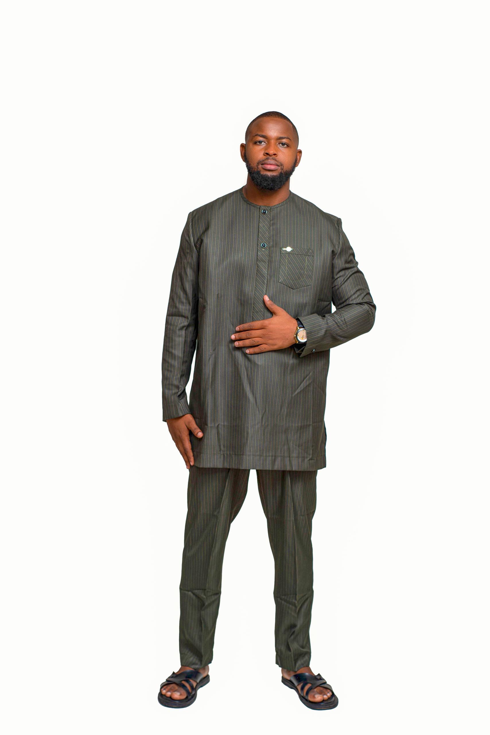 The “Olive Minimal” Classic Grand Boubou Set offers understated elegance for the modern gentleman. This two-piece olive green ensemble features fine pinstripes, a modest mandarin collar, and subtle chest pocket detailing. With its carefully tailored tunic and slim-fit trousers, it blends cultural tradition with polished contemporary style — perfect for business casual events, Friday prayers, or refined everyday wear.