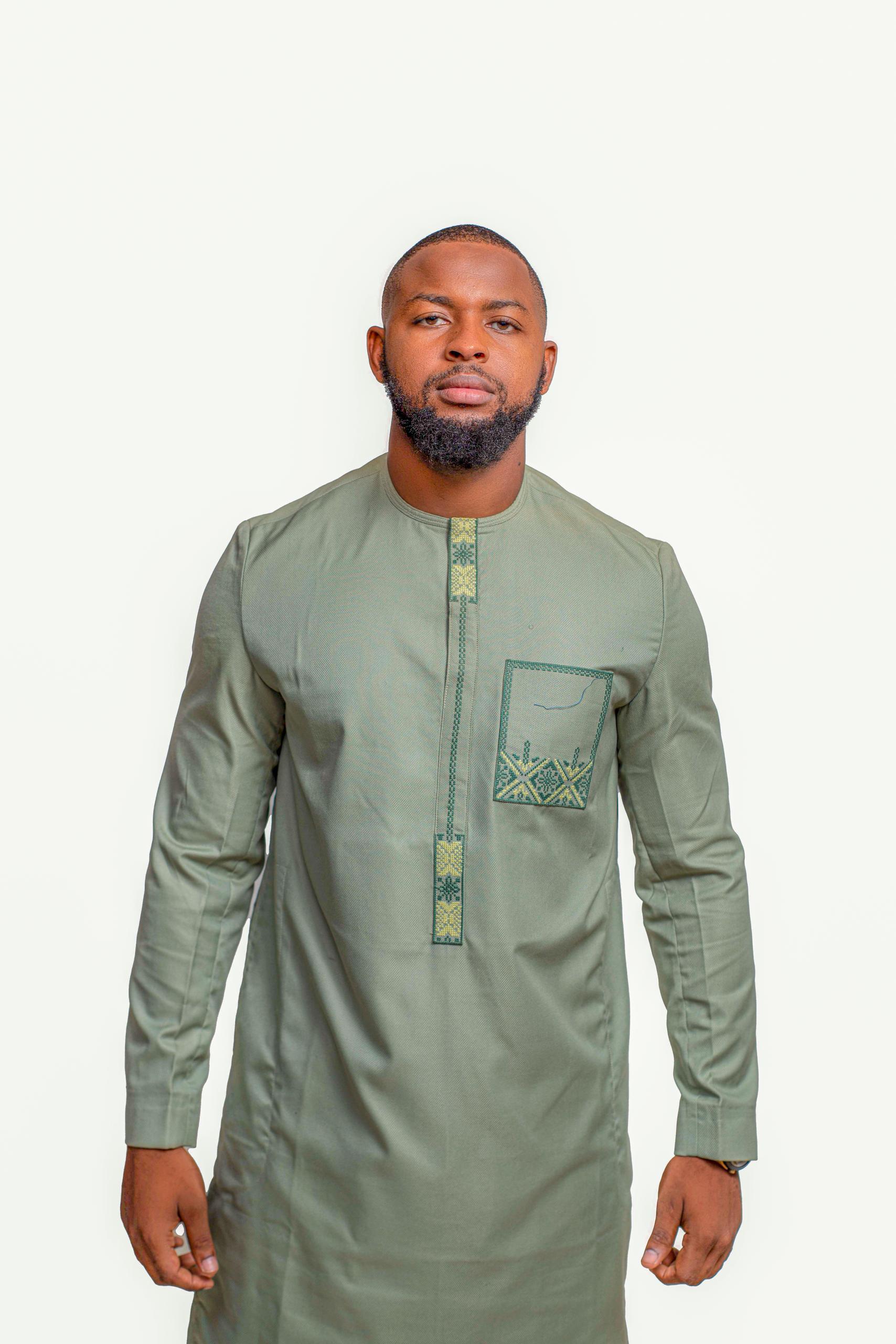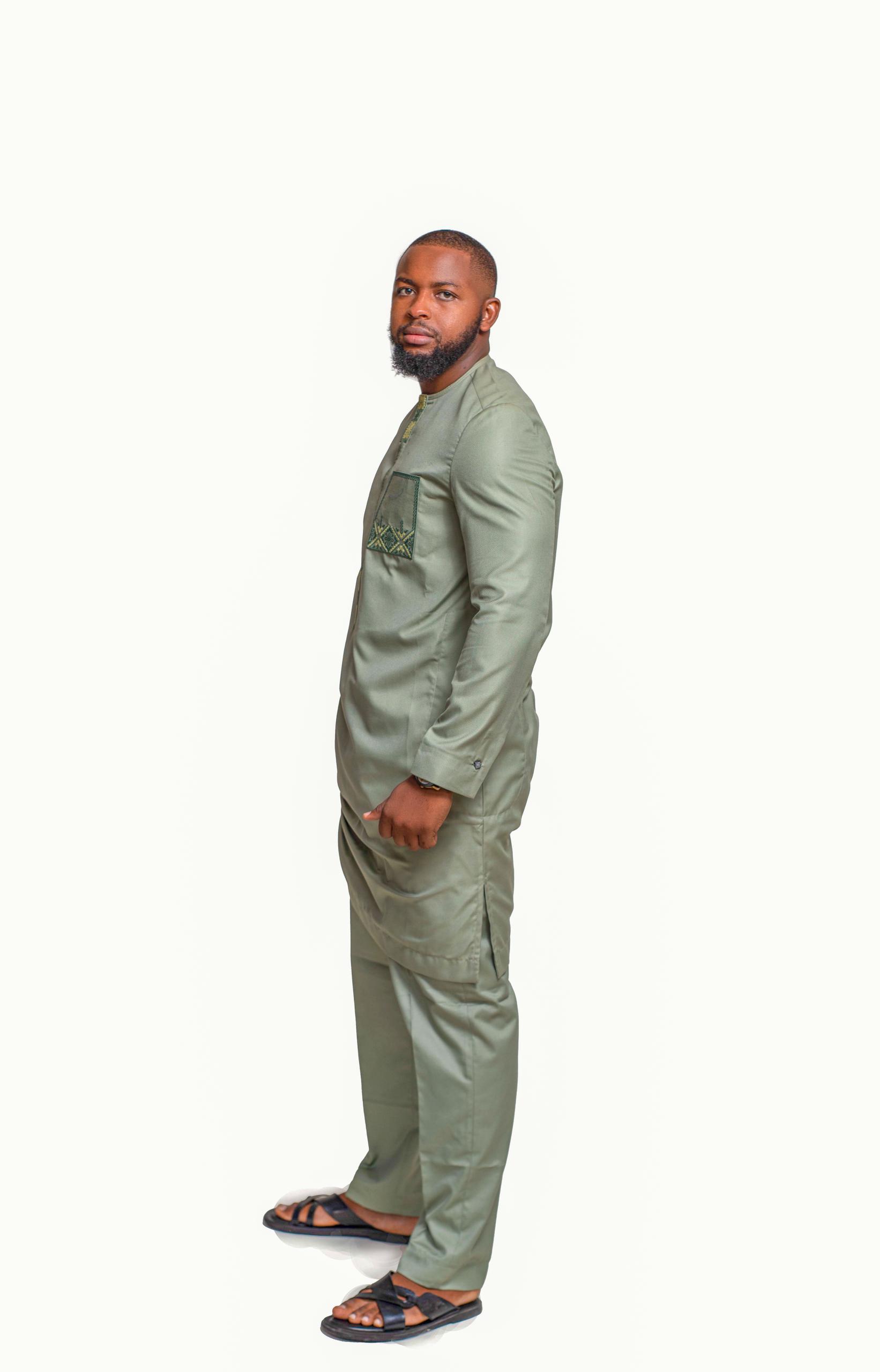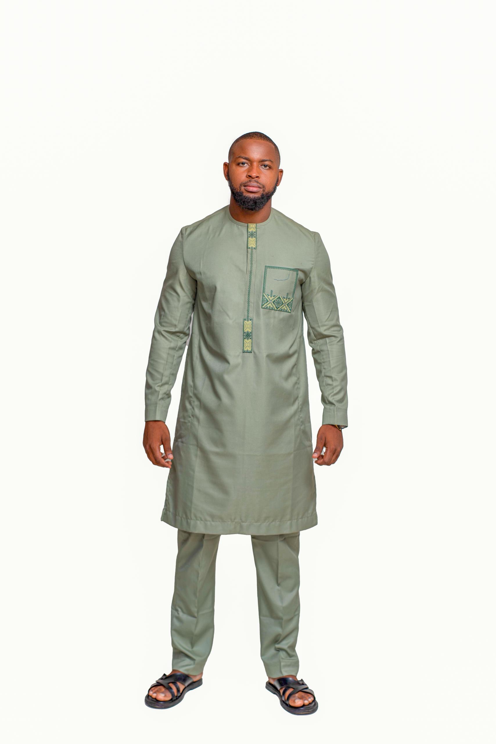 Step into refined elegance with the Sage Green Heritage Kaftan Set, designed for men who appreciate subtle sophistication with cultural depth. This two-piece ensemble features a long-sleeve kaftan in a soft sage green tone, paired with matching trousers for a coordinated look. The neckline and chest pocket are adorned with intricate green and gold embroidery, adding artisanal detail without overpowering the minimalist silhouette. Lightweight and breathable, this set is perfect for both festive gatherings and formal occasions.