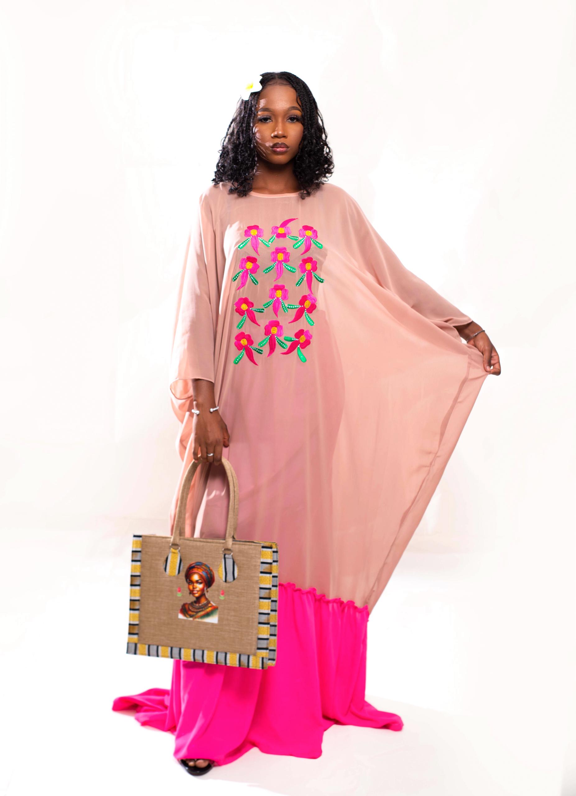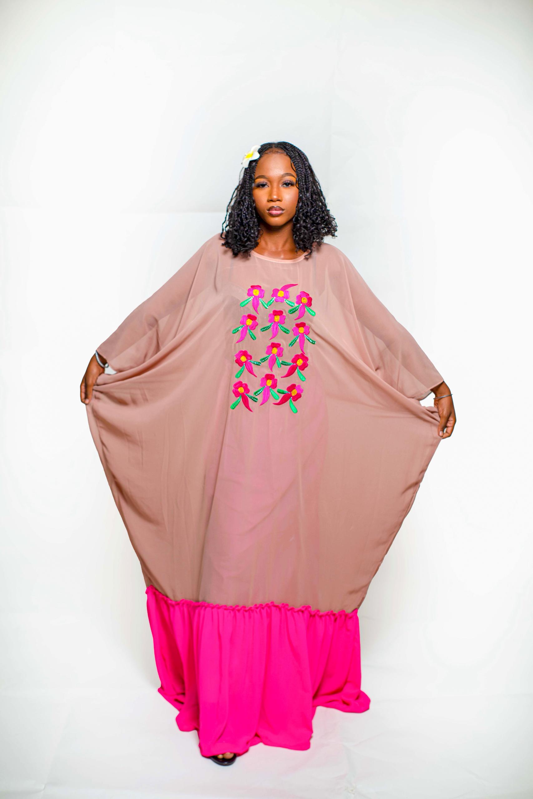 The Two-Tone Flowing Kaftan with Floral Embroidery embodies effortless elegance and cultural artistry. The upper section, in a soft earthy taupe, is brought to life with hand-embroidered floral motifs in pink and green, showcasing delicate craftsmanship. The design flows into a bold fuchsia ruffle hem, adding volume, movement, and a striking pop of color with every step.